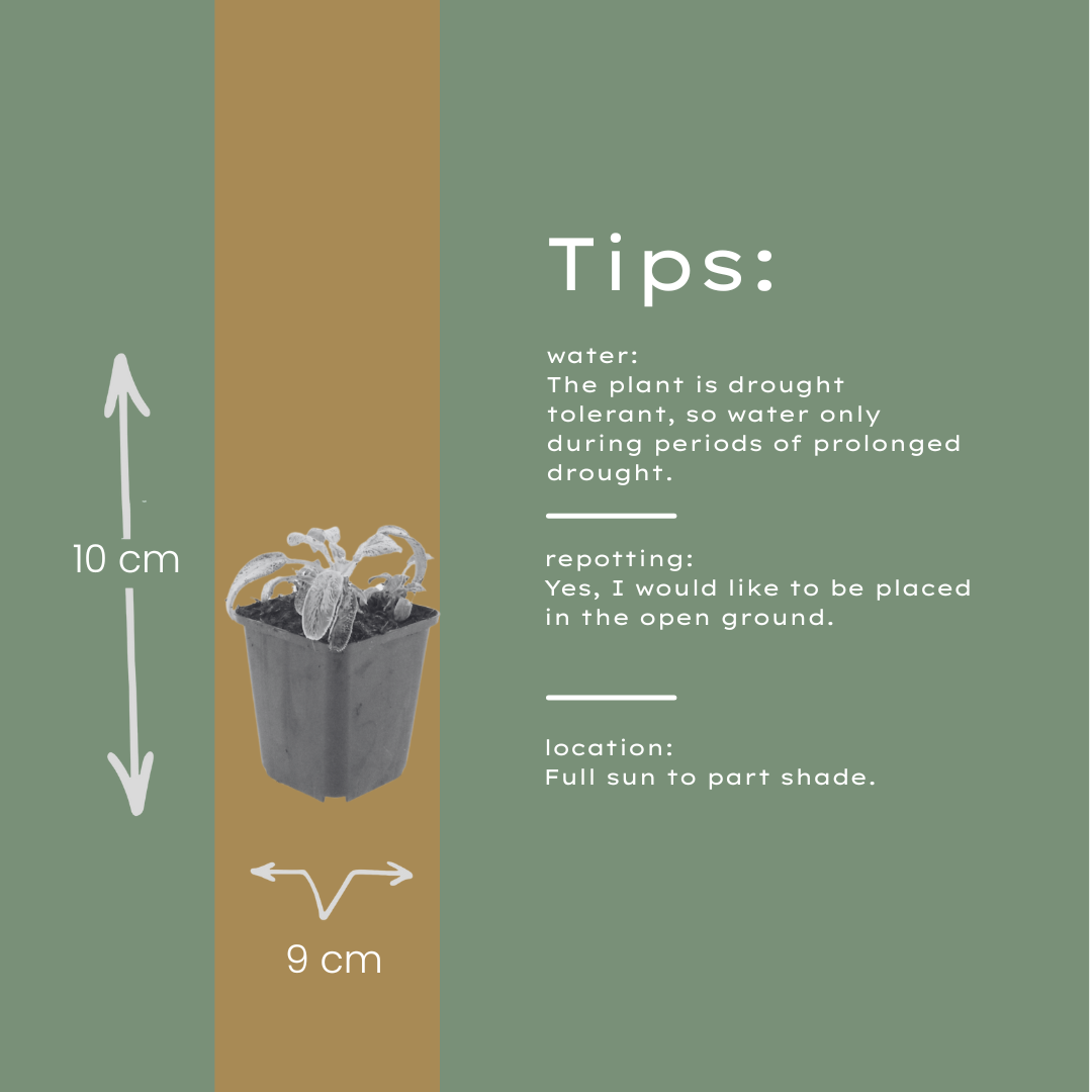 Die Pflanzen werden mit einer Lieferhöhe von etwa 10-25cm im praktischen Ø9cm Topf geliefert und lassen sich einfach pflanzen. Stachys byzantina ‘Silver Carpet’ bevorzugt sonnige Standorte mit gut durchlässigem Boden und zeigt sich dabei äußerst trockenheitsverträglich und pflegeleicht. Staunässe sollte vermieden werden, da die Pflanze trockene bis mäßig feuchte Bedingungen bevorzugt.