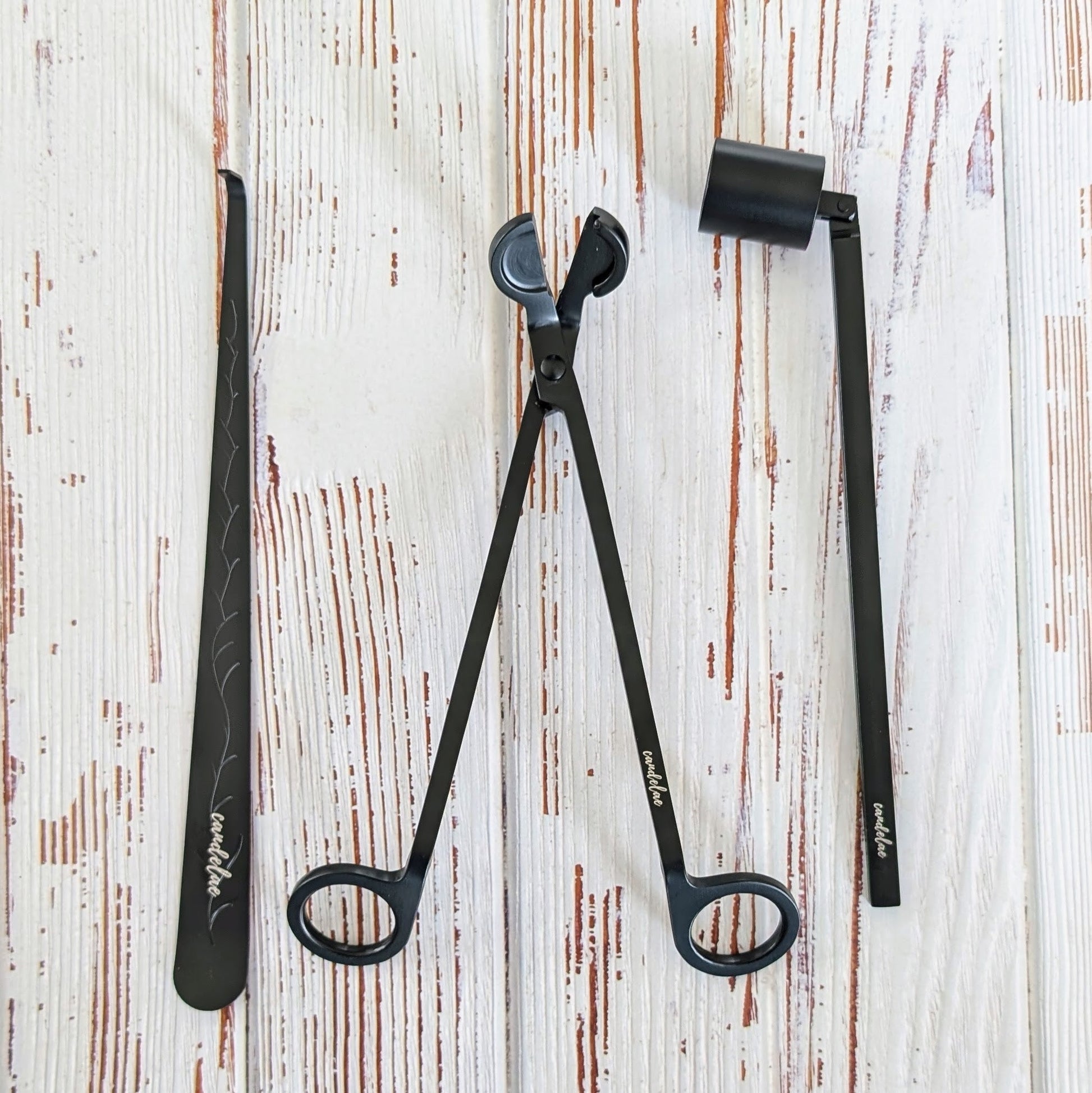 – Inhalt: Dochtschere · Kerzenlöscher · Dochtheber